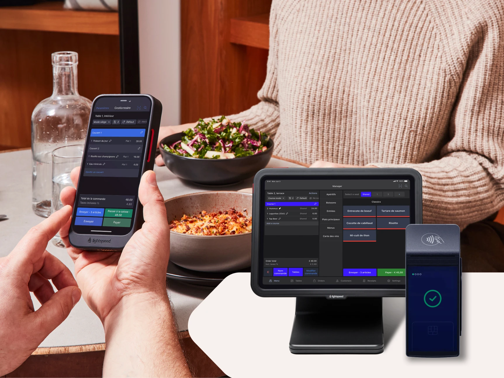 Commande à table, paiement intégré, réservations, écran cuisine, menu digital: tout est présent dans Lightspeed. Une seule plateforme pour tout gérer, plutôt qu'une de multiples outils.