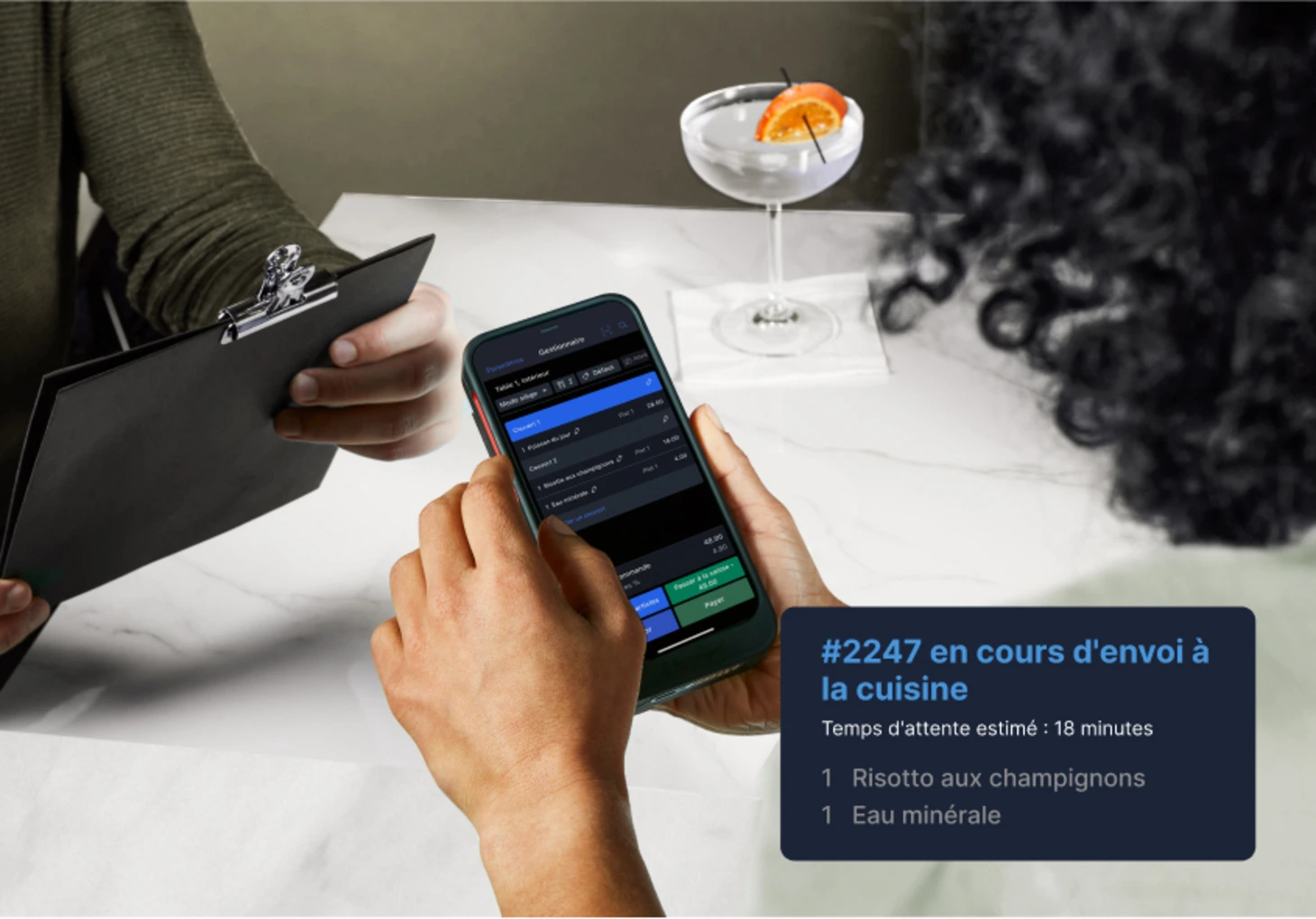 - Tableside : prise de commande sur iPhone à la table Votre serveur prend la commande sur son iPhone, directement à la table du client. La commande part en cuisine instantanément — pas de va-et-vient, pas d'erreur de retranscription. Les clients qui utilisent Tableside constatent +10% sur le ticket moyen.