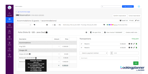 Le PMS Bookingplanner offre de nombreuses fonctionnalités pour simplifier les tâches administratives et les activités courantes de votre établissement, afin d’améliorer l’expérience client. L’intégration avec le système de caisse de Lightspeed vous permet d’ajouter des commandes Lightspeed directement sur le compte de la chambre dans votre PMS. Ainsi, tous les achats d’un client ou d’une chambre sont centralisés sur une seule facture, ce qui vous permet d’avoir une vue d’ensemble de toutes les transactions. Comme toutes les informations sont centralisées en un seul endroit, il est beaucoup plus facile d’analyser les rapports ou d’envoyer les informations nécessaires à votre comptable.