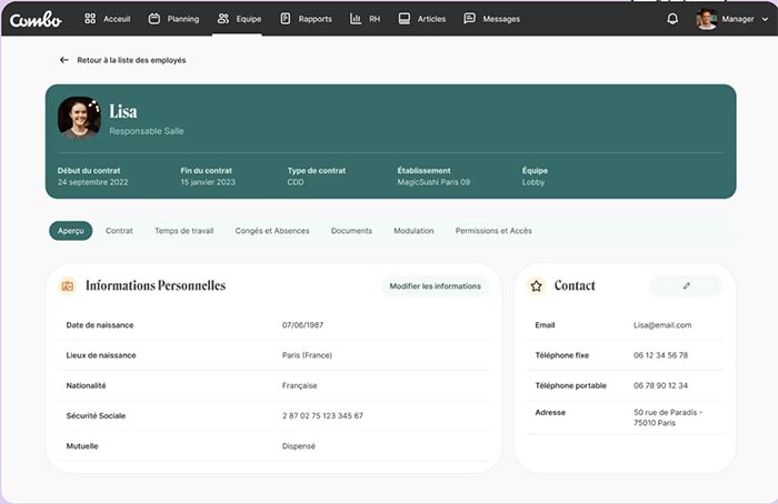 Nos 10 000 établissements clients sont fans (et leurs employés aussi !) “Un allié de poids dans notre gestion RH 💪 De la création des contrats à la sortie de l’employé, nous sommes guidé dans chaque étape RH de nos employés tout au long de leurs carrieres. Mention spéciale à la qualité du service d’assistance par chatbox/mail ! Je reprendrai Combo sur ma prochaine affaire les yeux fermés !” “C’est formidable, tout le monde est content, les employés sont avertis en cas de pépin ou à chaque mise en ligne. C’est beaucoup plus simple et on évite beaucoup d’erreurs. L’équipe est super réactive et très à l’écoute. Bravo !”